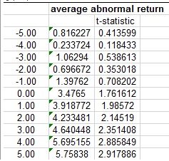 本人在做一个event study的研究.研究的内容是并购对企业股价的影响.样本选取了55家美国上市公司.用excel分析出来的结果显示如下: