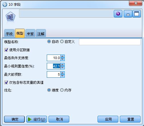 kuangsir6 发表于 2013-8-7 19:30 在Apriori节点里,点击“模型”选项板,在出现的对话框里就有“最小规则置信度(%)”设置文本框, 里面的 ...