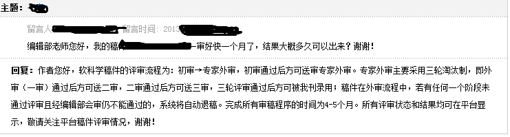 (3)审稿流程需要经历三次外审,具体的审稿流程可参见《软科学》官网“在线留言”中的官方回复,如下图: