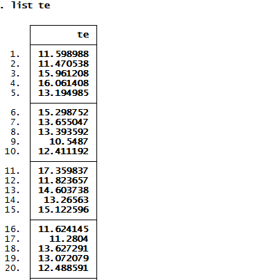 2、用stata的frontier回归后,predict te,然后list te之后,出来的均大于10,两者差好多。