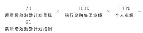 员工个人的质量绩效激励计划报酬取决于该银行金融集团业绩、员工的报酬级别及个人的当期表现。具体可以用以下公式计算。