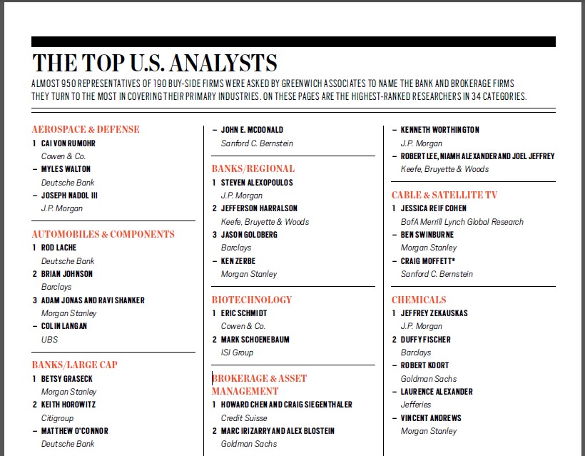 大约950个买方代表参与了这次调查,最后选出了34个领域里的顶尖分析师。不知道未来有没有机会看到华裔分析师的名字呢……