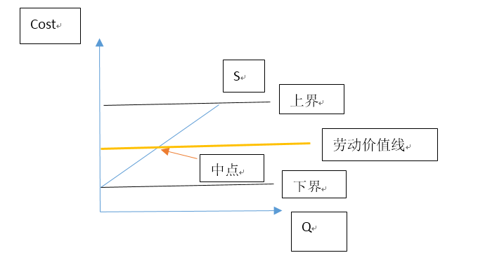图中黄色水平线,表达了短期中的行业平均成本,也就是所谓的“社会必要劳动时间”。俺称其为“劳动价值线”。
