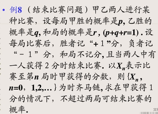 这个问题用高中的知识就能做,问题为不超过两局结束比赛的概率,这分为两种情况:一局结束比赛,两局结束比赛,概率分别为p和r*p,于是答案为p+r*p。 而这里文中给的解答使用转移矩阵来做