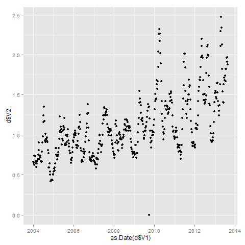 hubifeng? 发表于 2013-8-28 21:55 已解决: qplot(as.Date(d$V1),d$V2,data=d)