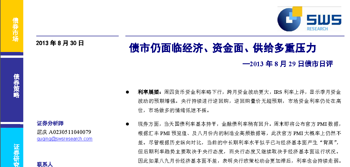 债市仍面临经济、资金面、供给多重压力 利率展望:周四货币资金利率略下行,跨月资金波动更大,IRS 利率上浮,显示季月资金波动的预期增强。央行持续进行逆回购,逆回购量价无超预期,市场资金利率仍处在高