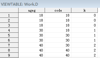 现在有两个问题:1.k在初始化的时候不是 空缺么?怎么第一个年龄组成了 0?;2.if code^=ageg then  k+1; 对于code=ageg的记录,k 变量的值怎么也自动过来了? 想不通,请大家帮我解释一下,谢谢!