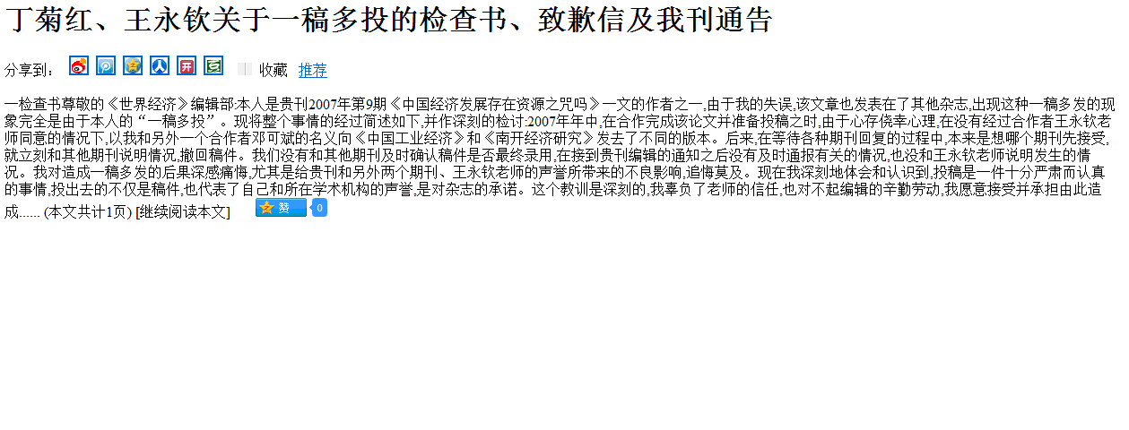 丁菊红、王永钦关于一稿多投的检查书、致歉信及我刊通告