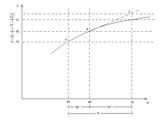 我们将上面所提到的一些主要变量标在图上,并设社会平均消费为AC,“富人”的平均消费为C1,“穷人”的平均消费为C2,C1与AC之差为C1’,C2,C2与AC之差为C2’。然后,我们在图中A,B两点之间作一条直线,并将其延长至与W1线相交的G点。并设G点对应的消费水平与C1之间的差为C1”。 由于所以。