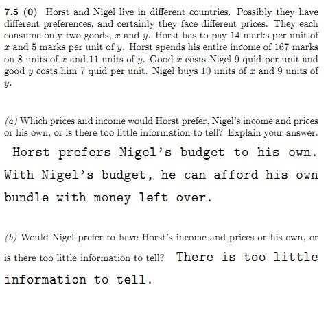 flumer 发表于 2013-9-21 15:08 Horst的消费束为(8,11),价格为(14,5) Nigel的消费束为(10,9),价格为(9,7) 我们并不知道Nigel有多少钱, ...