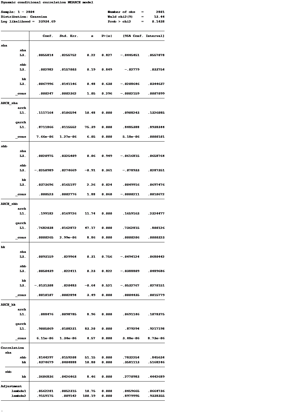 你应当是在分析SHA SHA和HK的收益率连动性,前面的可以理解为对SHA SHA和HK分别进行GARCH(1,1)回归的系数(分均值方程和方差方程),下面是三者间的相关系数,最后的DCC项的系数