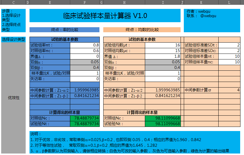 有基本的试验类型(优效,非劣性,等效)和终点变量类型(率,均数),其它更多的类型(单组目标值,生存分析等)还在完善中,欢迎大家提供宝贵建议。