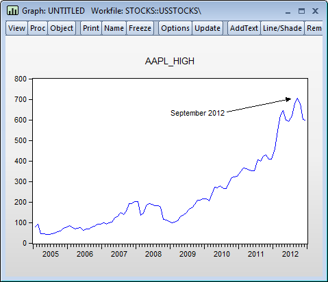 It’s often useful to accentuate a data point in a graph or draw a comparison between two points. In EViews 8, you can draw custom straight lines at any angle, anywhere in a frozen graph window. You may also choose from multiple designs for the arrowheads, including none (plain line), filled arrow, and open arrow.