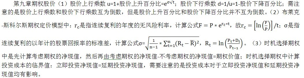 第八章资本预算(1)内含报酬率法中计算出的内含报酬率虽然是项目本身的报酬率,但是这并不意味着不再需要估计投资项目的资本成本或最低报酬率,我们需要将内含报酬率和资本成本或者最低报酬率对比,以确定方案的优劣。(2)采用加速折旧法计提折旧前几年多后几年少,因此项目采用加速折旧法,计算出来的方案净现值比采用直线法计提折旧大。采用沉淀资金折旧法会使前期折旧少,后期折旧多,计算出来的净现值比采用直线折旧法少。[也就是说沉淀资金折旧法是减速折旧法呗](3)调整现金流量法克服了风险调整折现率法夸大远期风险的缺点,主要表现在可以根据各年不同的风险程度,分别采用不同的肯定当量系数。(4)若资本市场是完善的,则可以使用企业当前的资本成本作为该项目的折现率,原因是完善的资本市场中,改变资本结构不影响资本成本。(5)评价资本预算项目特有风险时,使用最大最小法即根据净现值为零时选定变量的临界值来评价;使用敏感程度法时,根据选定变量的敏感系数来评价;使用情景分析法时,是根据项目的期望净现值及其离散程度来评价;使用蒙特卡洛模拟法分析时,根据项目净现值的概率分布来评价。(6)蒙特卡洛模拟是敏感分析和概率分布原理的结合。(7)更新决策中条件:运行效率提高减少半成品存货占用资金。这个条件意味着项目期初营运资本少垫支[+],项目期末营运资本少回收[-]。