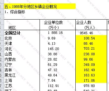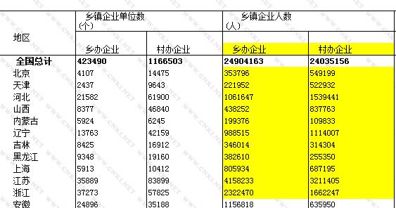 下面三幅图是三个不同来源的乡镇企业数据,以企业人数为例,中国农村统计年鉴中北京是90.3万,与中国统计年鉴的数目相同;但是乡镇企业年鉴中的是108.54万。企业个数也是不同的。而农村统计年鉴中对乡镇企业的称呼是“乡村两级企业”,即统计年鉴中所区分的“乡办企业”和“村办企业”。
