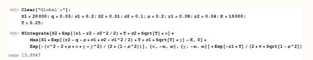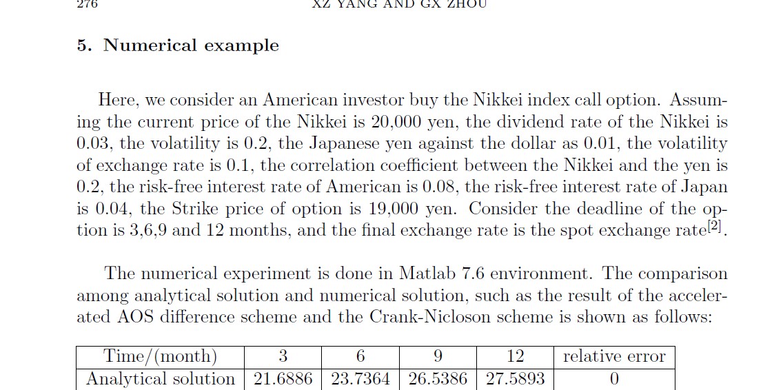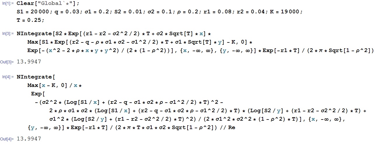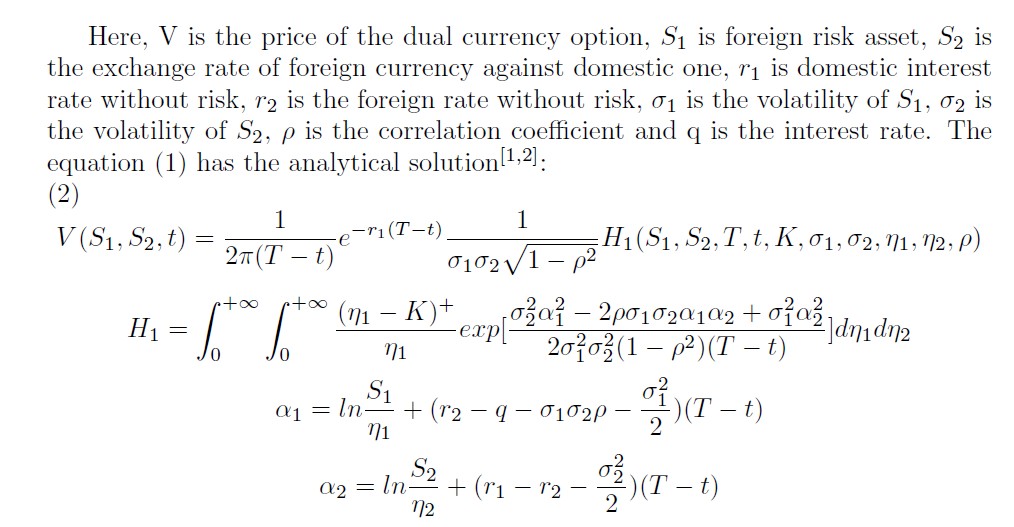 Foreign equity call struck in foreign currency. The first case, that of a foreign equity call with striking price K also in foreign currency is particularly simple. The necessary observation is that S2 plays an almost trivial role in the payoff: whatever payment in the foreign currency results from exercise of the option is just converted at the spot exchange rate at expiration. To make use of this point, consider an option writer located in the country (日本)where S1 is traded. She is indifferent (in a frictionless market) between this call - paying off in your currency (美元)- and a standard option on S1 paying off in her own(日元). Accordingly, the present value in foreign units of the call is just given by the Black-Scholes formula. To obtain the domestic value of the option we need only invoke the law of one price, which requires that identical contracts have equivalent prices in all markets, to find (by multiplying by the spot exchange rate)