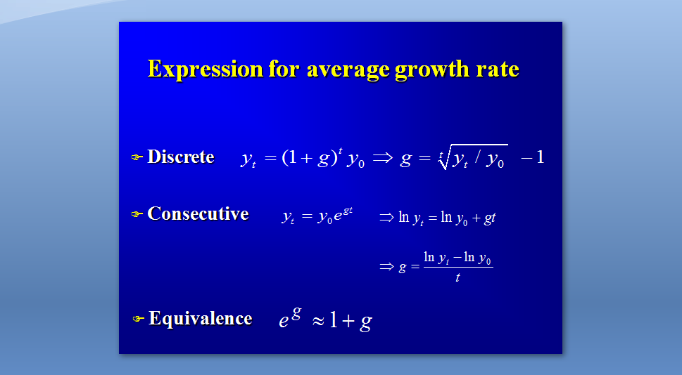 我们中宏老师在课上讲到这张ppt的时候,说这里有两个公式,一个是离散情况下的,一个是连续情况下的。她说连续情况下的那个公式只是一个近似,其实实际上应该是和离散情况下的那个公式是一样的,但是由于若t为无理数时画不出一个连续图像而做的近似。ppt最下面也做了这个近似的说明,易知这个近似是由洛必达法则得到的,即当g趋于0的时候,e的g次方与1+g是等价的。但是由洛必达法则可知,当g趋于0时,1+g还可以和很多其他等式近似,例如1+sing,但为什么要用ppt中的这个近似呢?
