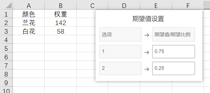 数据格式如下图:上传数据至SPSSAU系统后,选择【卡方拟合优度】检验,设置期望值为0.75和0.25.