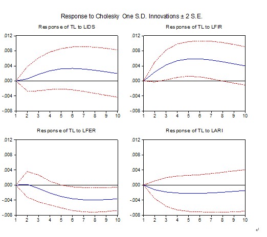 mrli2051 发表于 2015-2-20 03:06 脉冲响应函数反映了随机扰动项(随机误差项)的冲击对其他变量带来的动态影响,是一种短、中期关系(可以统 ...