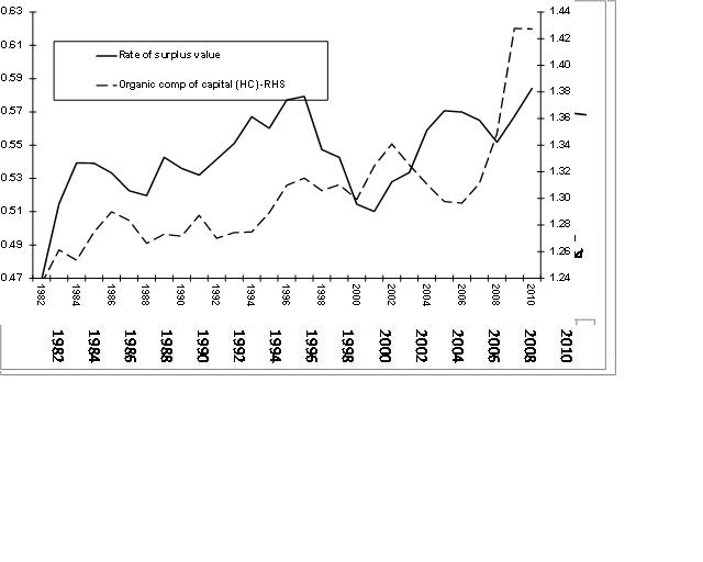 Figure 3. US ratio of surplus value to employee compensation and the organic composition of capital