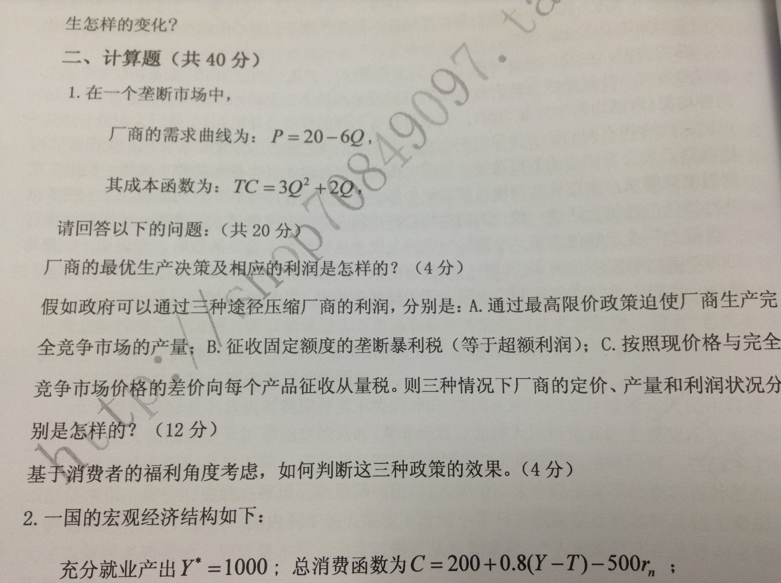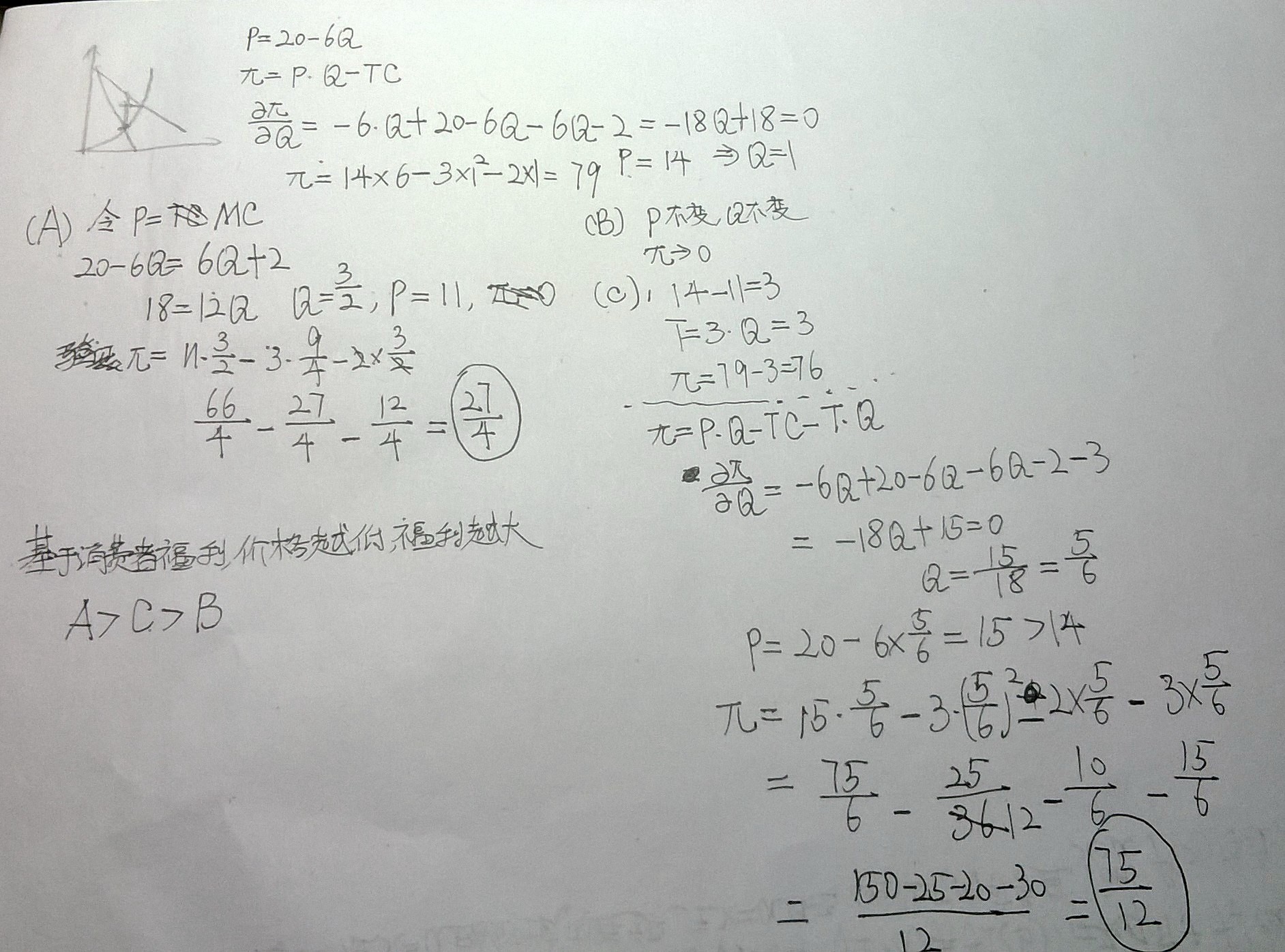 璨澜 发表于 2013-12-3 14:04 B的定价和数量与完全垄断情况下一样,只是利润都被征收,企业利润为0;A是按照P*(完全竞争时候的价格,应该 ...