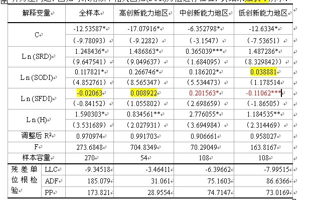 小女子毕业论文实证结果做出来,不指导怎么分析。求大神指点迷津。结果如图所示。标了颜色的,是没有通过检验的。被解释变量为专利授权量,解释变量分别是SRD、SODI、SFDI、H分别代表的是我国研发存量,通过ODI渠道和FDI 渠道溢出的国外资本存量,人力资本存量。我的问题有:1.中等创新能力地区,SRD系数怎么会事最小的呢?2.SFDI系数在低创新能力地区怎么为负数呢。
