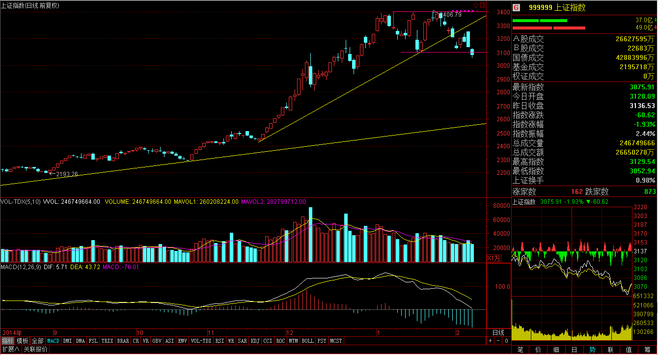 上周末股指跌破中期上升趋势线,本周末跌破前期回调低点。如图所示。