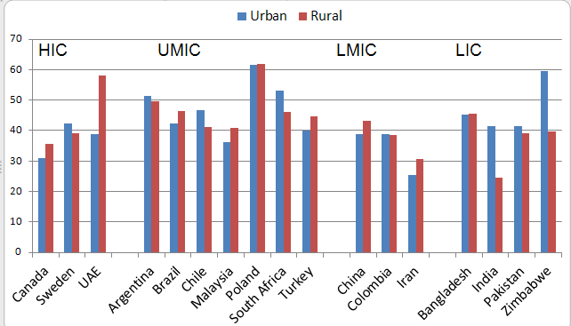 如下图,横轴有两级分类变量(hic umic lmic lic 为四个大组,组间有较大的SPACE 是一级分类变量, 横轴国家为二级分类变量,每个国家又分了城乡两亚组),如何在SAS GCHART 或SAS SGPLOT里实现?