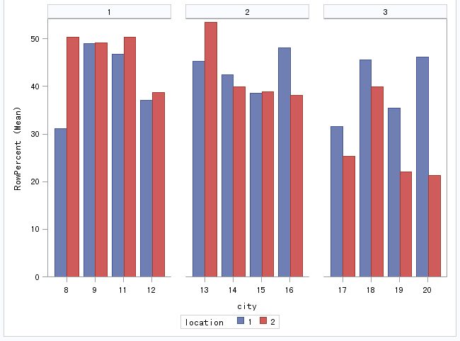 以CITY, GROUP分类变量分横轴的分类变量(GROUP 为三个大组,组间要有较大的SPACE,为一级分类变量, 横轴city为二级分类变量 ,每个CITY 分LOCATION),location 是clustered方式出现。