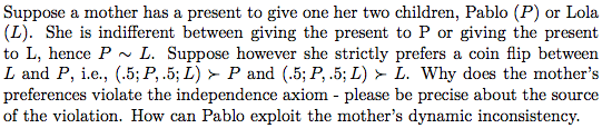 假设一个妈妈有两个孩子,Pablo (P)和Lola(L),她要给其中一个孩子一个礼物。这个妈妈对于给p或给L无差异,也就是说P~L。但是这个妈妈强偏好于扔硬币决定给哪个孩子。换句话说(0.5;P,0.5;L) > P 以及(0.5;P,0.5;L) > L。为什么妈妈的偏好违背了独立性公理?请明确之处根本上为何违背。Pablo可以怎样发现妈妈偏好上的不一致?(最后这句翻译的好奇怪啊。。。。可能意思就是说做一个实验设计吧~怎样表现出妈妈违背了独立性公理)