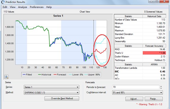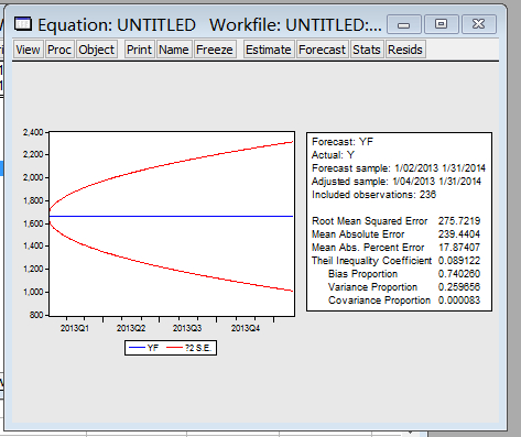 这个是源数据 我用模型ARMA(1,1,4)进行拟合,在eviews6.0中对数据进行预测,预测2013年12月2号到2014年1月31号的数据。为什么我得出这样子的图形?