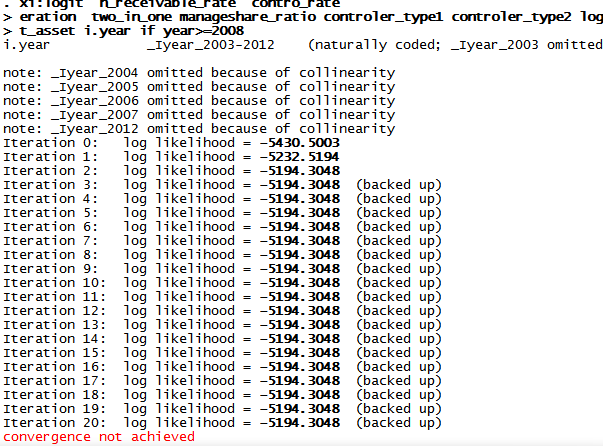 模型无法收敛可能存在完全共线性问题,可也去掉一些变量试试