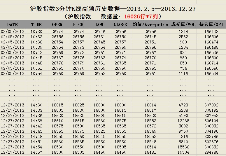 沪胶指数3分钟K线高频历史数据—2013.2.5—2013.12.27