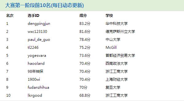 当然,参赛选手得分中也不乏高分的,其中80分以上的就有两人,分别为华中科技大学的dengpinjun选手,83.2分,是迄今的最高分;还有一位是德克萨斯州立大学的选手wxc123130,81.6分。而且第一阶段比赛成绩屡创新高,相信本次比赛将是高手云集的一场赛事。有志于挑战自己的选手,不要放过这次机会哦~