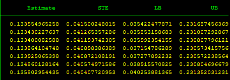 黑桃皇后 发表于 2014-1-10 21:33 第一列是估计值,第二列显著性水平(疑?)。第三列,low boundry。第四列,upper boundry