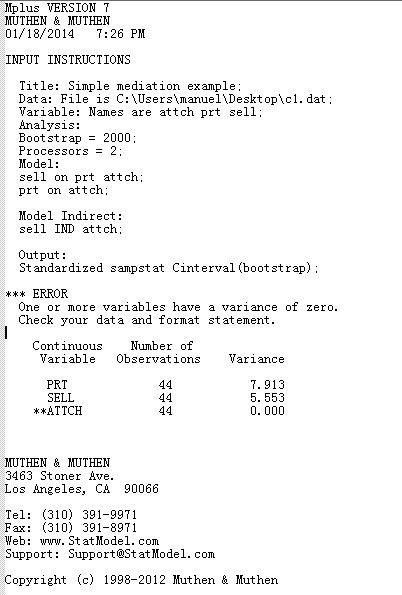 小弟因为毕业论文要做一个中介分析,第一次用mplus,按照例子上的来做,但是不知道咋回事就是做不出来