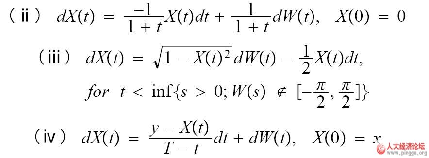 (iv) X(t) = x * (1 - t / T) + y * t / T + (T - t) \int_0^t 1 / (T - s) dW(s)