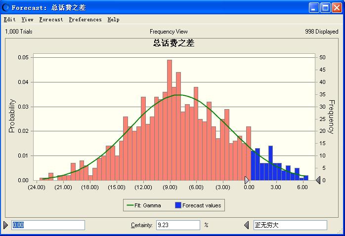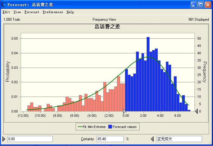 按照此种情况下两种套餐的话费之差设定为预测变量,Crystal Ball求解出来的结果如下:
