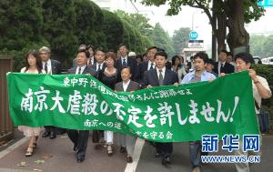 2006年6月30日,南京大屠杀幸存者夏淑琴(前排右四)在日本东京与支持者手持“不许否定南京大屠杀”的横幅走向东京地方法院。2月25日下午,十二届全国人大常委会第七次会议审议全国人大常委会关于设立南京大屠杀死难者国家公祭日的决定草案。决定草案将12月13日设立为南京大屠杀死难者国家公祭日。新华社记者 吴谷丰 摄