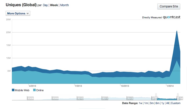 Newlin指出:“在1月末的某一天,这些测验为我们带来了600万次访问。几乎很少有网站能在一天内多出这么多流量。但是我们并没有期望这些测验会一直这么火热下去,它肯定会有衰落的一天。”(viamashable 译/快鲤鱼,不代表本坛观点,仅供参考。)