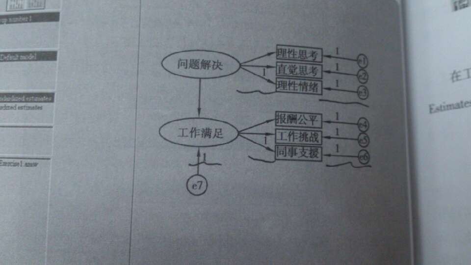 问题解决与工作满足之间是单箭头,这属于因果模型。在因果模型图中作为因变量,即工作满足,必须增列一个预测残差项,而残差项的路径系数和测量模型的误差项一样,要界定为1。