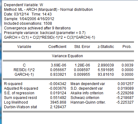 小弟刚刚开始学习GARCH模型,对很多东西一知半解。 试着把沪深300的大盘指数的日对数收益率(r) 导入 eviews, 并用 eviews 直接做出了GARCH的结果, 如下图: