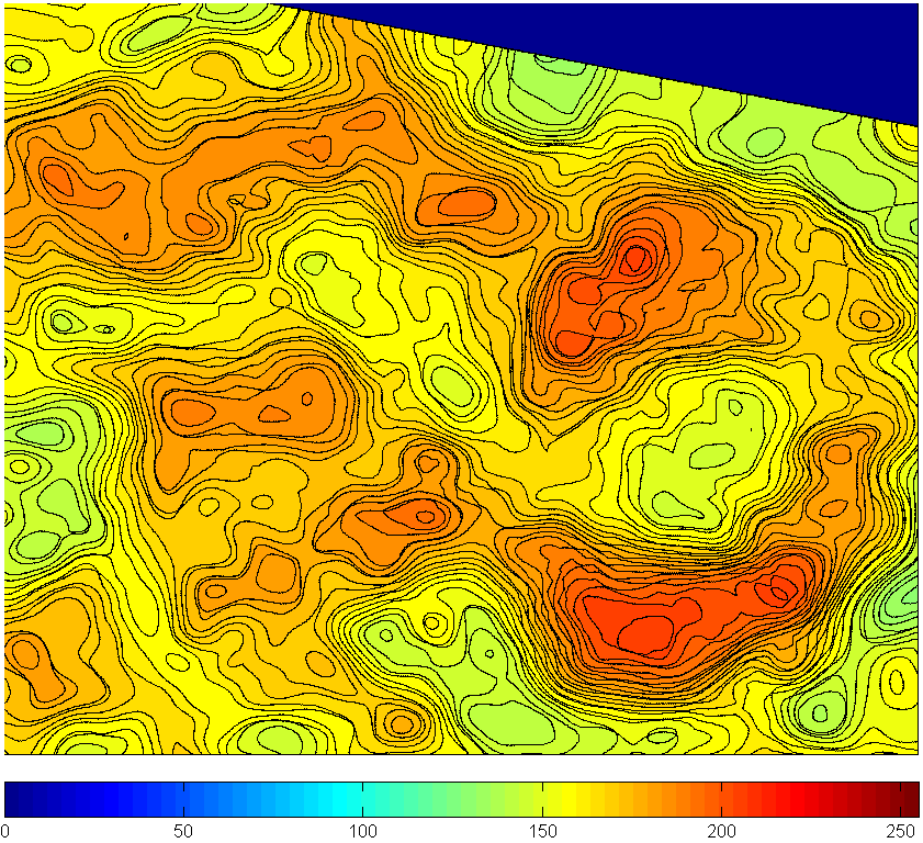 中国资源卫星应用中心提供了2012/10/11,10:30am过境北京市区的中国资源三号高分辨率(5.8m)卫星图像(图1)当天北京市天气晴朗,微风,没有雾和风扩散效应(http://lishi.tianqi.com/beijing/201210.html),是一幅非常典型的卫星图像。从图1可以清楚地看出,除了左上角的山区和右下角的农田区之外,晴天的北京市上空笼罩着相当严重的霾。采用最先进的高分辨率卫星图像霾分离技术COOL(Controllable Objectively Optimized Lessening/removing-haze),我们成功地将霾污染层从卫星图像中分离出来,获得了北京市区霾污染的详细分布,并由此根据同步地面观测资料,分析导出PM2.5的分布(图2)。