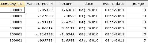 stata实现事件研究法的过程中,可以用普林斯顿大学的程序实现,然而,我发现该程序,在处理数据的时候,用merge命令,会将一个公司对应n个事件(同一类事件),得到类似于如下表格