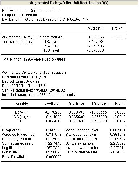 1994年4月到2014年2月的时间序列数据,目前我看不平稳,一差分平稳,但偏自相关图看不出如何定模型,求各大神帮助,在线等!!