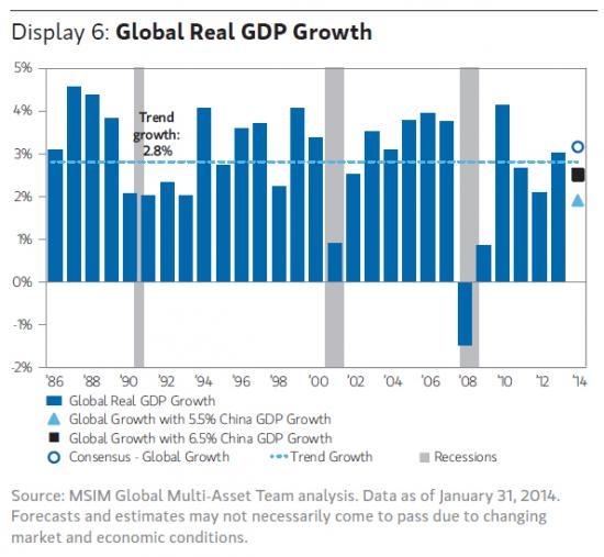我们看到,许多分析师认为中国经济增长将比目前预期的还要慢,但全球经济已经为此做好了准备。但我们的结论更加悲观:我们认为,中国GDP增长每减慢1%,全球经济增长就会随之放缓0.6%。在中国经济增长7.4%的基础上,2014至2015年,全球经济增速约为3%左右(下图Display 6).