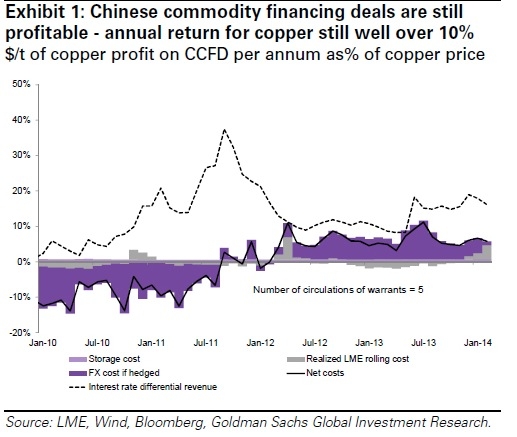高盛:中国贸易融资活动2年内绝迹 与一些媒体的报道相反,我们发现大量的中国商品贸易融资交易仍在进行,帮助“热钱”流入中国,并提供了一个渠道引入廉价的外国融资。整体上说,大部分经过汇率和商品价格对冲处理的中国商品贸易融资交易的利润空间仍然是巨大的,这受益于人民币与美元基础利率的差异(>4%),过去几个月人民币的有限贬值(<2%),人民币的远期汇率曲线(对冲汇率头寸的成本有限),以及相关的大宗商品市场也没有出现紧张(即对冲商品价格的成本有限).