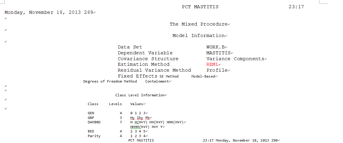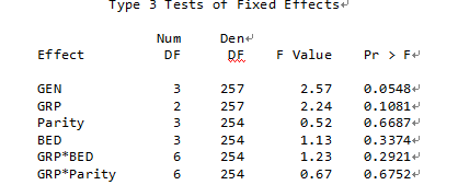 Num Den Effect DF DF F Value Pr > F GEN 3 257 2.57 0.0548 GRP 2 257 2.24 0.1081 Parity 3 254 0.52 0.6687 BED 3 254 1.13 0.3374 GRP*BED 6 254 1.23 0.2921 GRP*Parity 6 254 0.67 0.6752