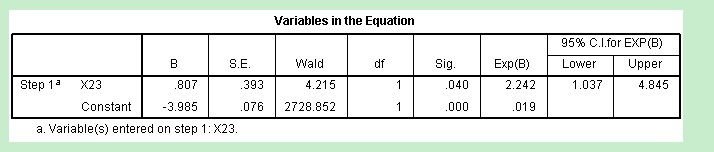 We are interested in the results for the Pearson Chi-Square. We can see here that χ23 = 4.447, p = 0.035. This tells us that there is statistically significant association between Y and X23 at 5% level.
