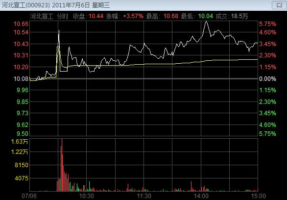 如图2所示,这是7月6日河北宣工(000923)盘口的表现,相信投资者看了这张图就有答案了。当日该股开盘表现平稳,盘中却突然上扬,之后迅速跳水,这种分时走势就是上面说到的“一刀断魂”砸盘出货。